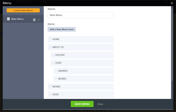 Aquí Usted puede añadir nuevas secciones, páginas, así como crear un nuevo tipo de menú.