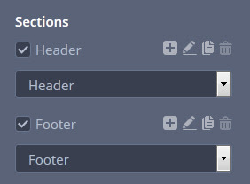 La estructura puede ser extendida o regular. La estructura regular se compone de tres partes - una cabecera (header), una parte principal y un pie de página. Si está utilizando este tipo de estructura – aquí Usted puede modificar sus ajustes o duplicar estas secciones, cambiar sus nombres y agregar nuevas (haga clic en los iconos de “plus”, “lapiz”, “documento”, “basura”):